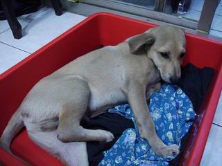 前天(2008.5/6)晚間爸爸聽到外頭有小狗哭嚎聲,從二樓窗戶看下去發現牠躲在我們家社區公共休閒座椅旁邊哭嚎,身邊僅只有不知道誰丟給牠的破花襯衫一件和一條褲子鋪著,外頭天氣濕冷又寒風陣陣,於是將牠檢進家門來避雨遮風睡一晚。