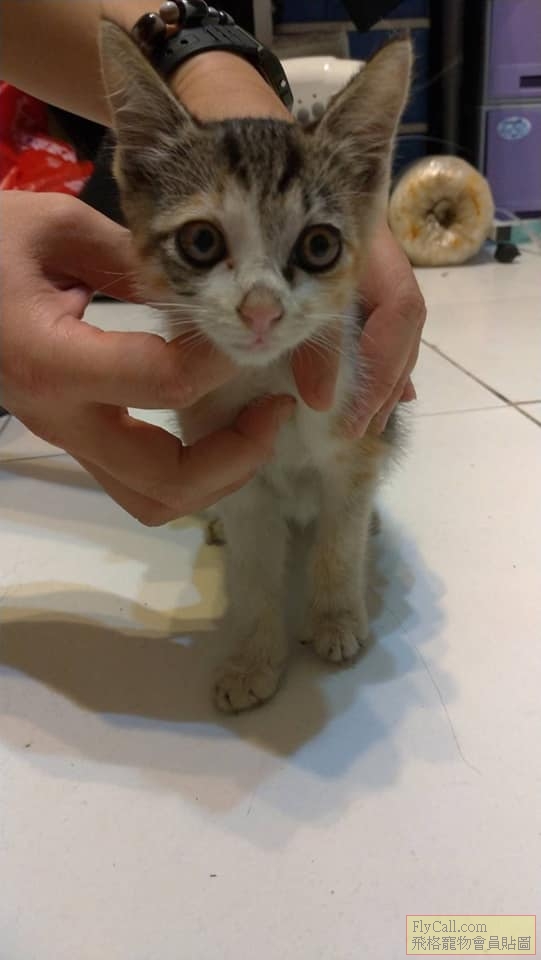 今天下午在路邊撿到一隻小三花,應該是餓翻了,牠一直追逐偶爾經過的車,我才一停車,牠馬上就衝到我車旁,牠不知道叫多久了,已經叫到燒聲,怕牠被車撞,所以就把牠帶回家,但家中貓口已經爆炸了,不知是否有善心人士可收編 牠蠻親人的