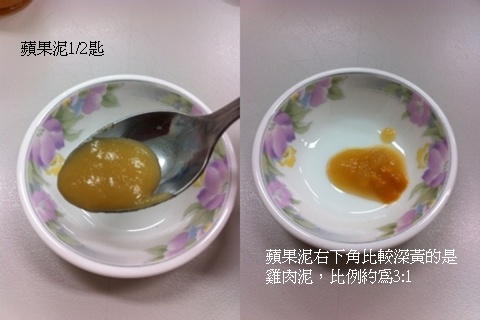 2.蘋果泥一小匙+一點點雞肉泥(比例約為3:1)