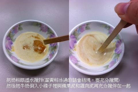 5.將攪勻的奶水倒入小碟子中,與蘋果雞肉泥再仔細攪拌即可