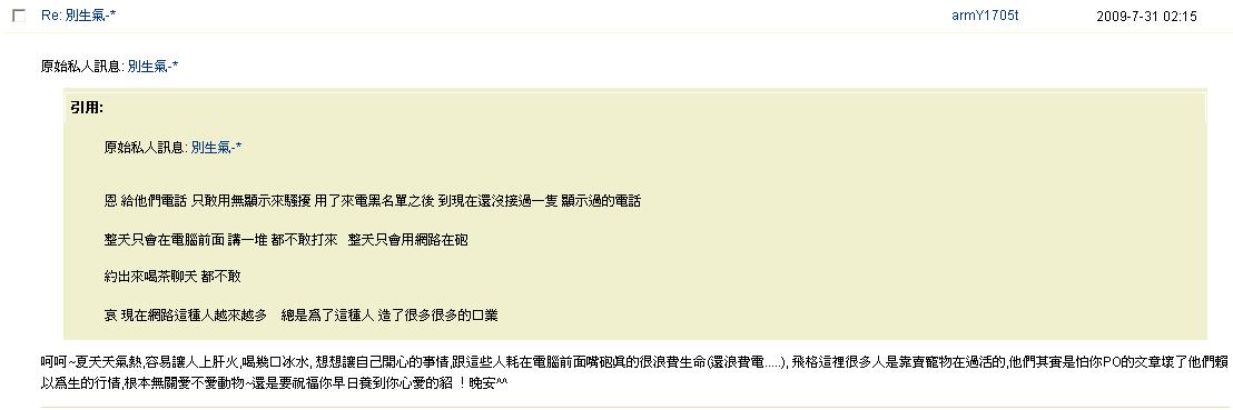 整天看一群畜牲 自己在罵 自己在爽 當笑話看也好 呵呵 反正就是沒人敢打電話