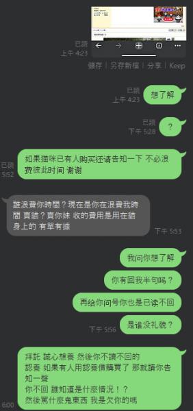 誠心購買領養貓咪 對方已讀不回 還嗆人