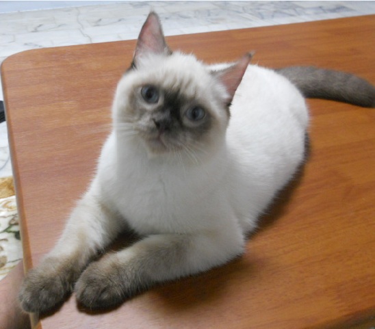 它有粗粗的尾巴 圓形臉 兩眼之間相隔一個眼睛的距離 其中以巧克力重點色最為稀有 [聽說是比較難配出來] 毛算中等長度 巧克力重點色 眼睛一定是藍色