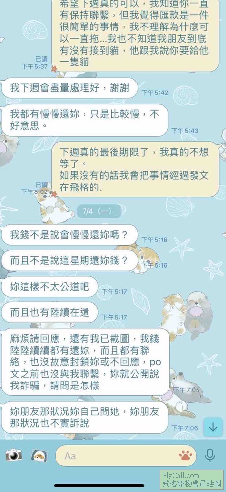 有好幾個人跟我說了送養的貓咪都是有問題,說是健康的其實貓癬很嚴重,且我當初匯款給他一堆問題,當我發文才急著密我要退錢給我,當初也跟他說了這個禮拜再不退錢就發文錢也不打算要回來了,每次都要我問什麼時候要退錢?