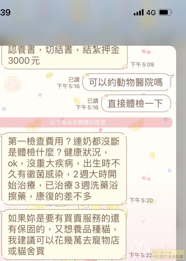 約在去年的5.6月的時候看到一篇金吉拉認養,加了賴好友,詢問那個人,那個人說目前小貓還小,大概還要一個月,需要先付訂金3000,領養後再付3000,結紮之後會退回3000,之後各種理由小貓被偷、家人過世、蜂窩性組織住院等等各種理由, ...