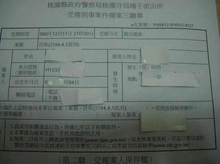 打不通了.於是桃園南坎的空軍一號還幫我打電話給所有苗栗的寄件站問得到的答案都是沒有.我心理大概知道我被騙了.但我還是等到18:00的那班車來確定沒有.我才走的~~接下來當然就是請我朋友陪我去警察局報案了.警察要我先傳訊息給他.等他一天確定