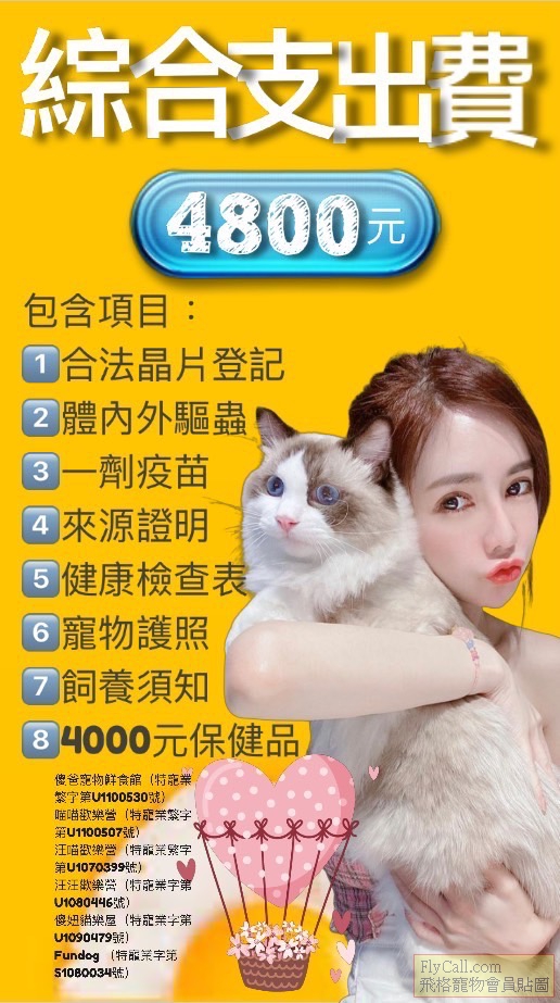 辦理綜支費4800元項目如下晶片登記/ㄧ劑疫苗/體內外驅蟲/健康護照/飼養須知/來源證明/健康檢查表/4000元保健食品