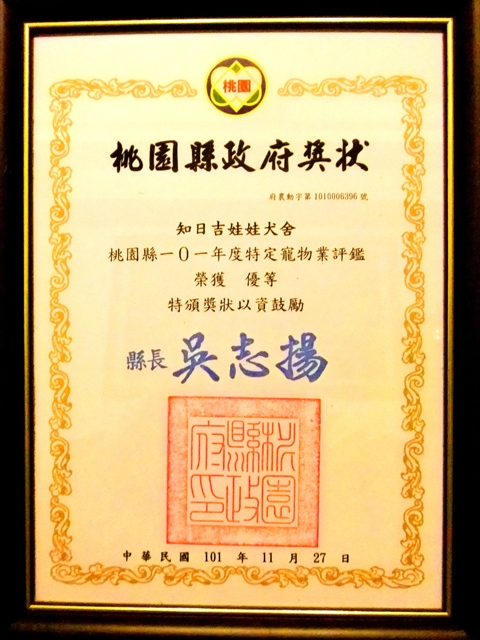 2012_1208Image0107知日犬舍2012特定寵物業評鑑獎狀.JPG