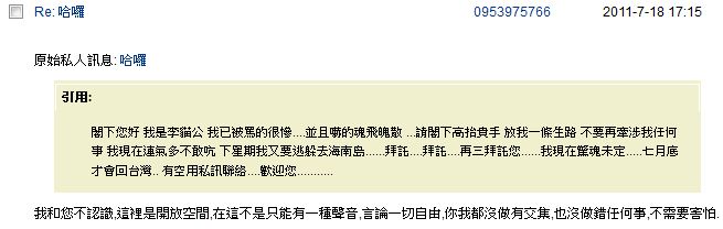 原文由 0953975766 於 2011-7-26 17:32 發表 閣下 我李貓公以前好像沒有得罪過你的地方......你大可不必如此.....我有得罪過你的地方 ....我還是鄭重向你致歉.......貓靈奶奶及玉璇兩位大大與我的問題..我已正式向警方報案.....全案已進入司法程序中.....靜待 ...